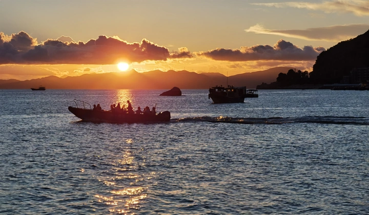 夕阳把归途铺成金浪, 小船载着满舱的晚风与烟火, 缓缓驶向暮色深处。 远山衔着落日,礁石静候归航, 每一道波光,都是家的方向。