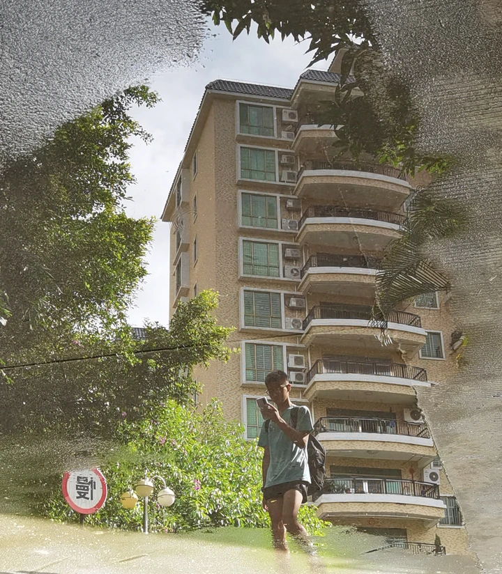 雨过天晴,水洼成了天然的取景框,把楼宇、树影都揉进这片温柔里,少年踏光而过,成了这幅倒影里最鲜活的注脚。