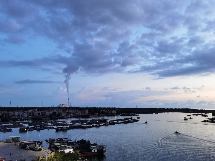 暮色漫过渔港,远处发电厂烟囱吐出的蒸汽,正慢慢融进渐暗的云里,把工业的呼吸,轻轻叠在渔村的黄昏之上。海面上,船辙与云影交错,两种生活的节奏,在同一片天色里温柔共振。