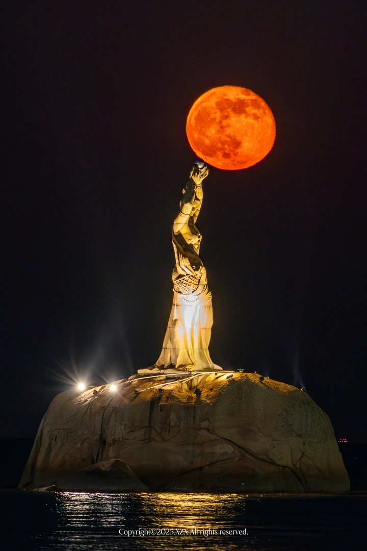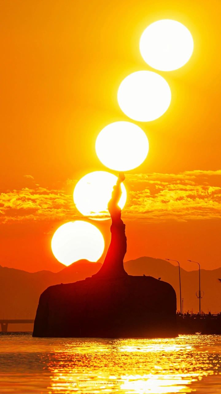7张 7张- 渔女悬日- 赶在城市睡醒前见渔女与日出同框,太阳慢慢爬上来,把她手里的珍珠衬得像在发光。