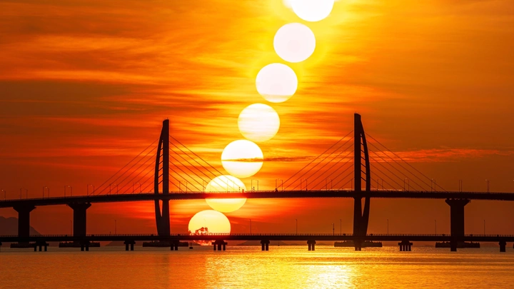 8张 8张- 日出的浪漫具象化- 当太阳跃出海面,风帆塔突然有了生命——它不再是混凝土建筑,是迎着朝霞启航的巨轮,是连接湾区的光的坐标。海风裹着暖意拂过镜头,连影子都成了向光明奔赴的形状。