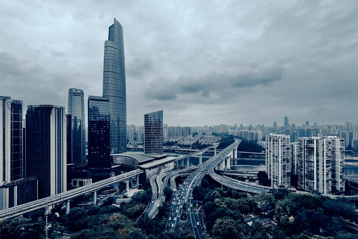 夏日傍晚的雨后,站在南岸的高处,眺望朝天门方向,城市上空风起云涌,乌云翻涌如墨,低低地压在高楼大厦之间。霓虹灯在湿润的空气中折射出迷离的光影,江水反射着斑驳的色彩,仿佛现实与幻境交织。风掠过楼宇缝隙,带来一丝不安的气息,整个城市仿佛被一种神秘而压迫的力量笼罩,魔幻而震撼。