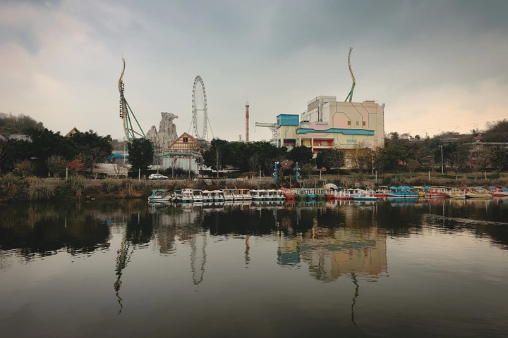 在雨的间隙,小湖边散步,对岸的游乐场似乎没有太多的喧闹,岸边停靠着五彩斑斓的小游船,天空在水面留下漂亮的倒影。这个画面的色彩很舒服,让我忍不住拿出手机,记录下这美好的瞬间。