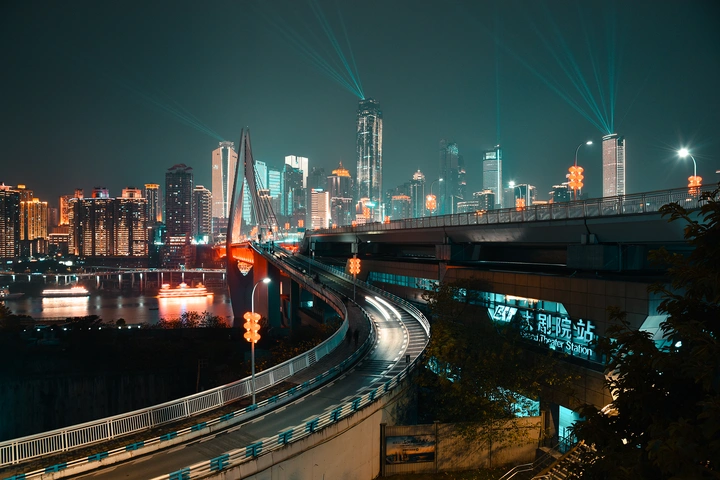在重庆,千厮门大桥的江北桥头,下桥的匝道转了个弯,和笔直的大桥形成搭配,桥下的轻轨站发出的蓝光正好与远处的建筑物的灯光呼应,所以这里也是一个网红机位。