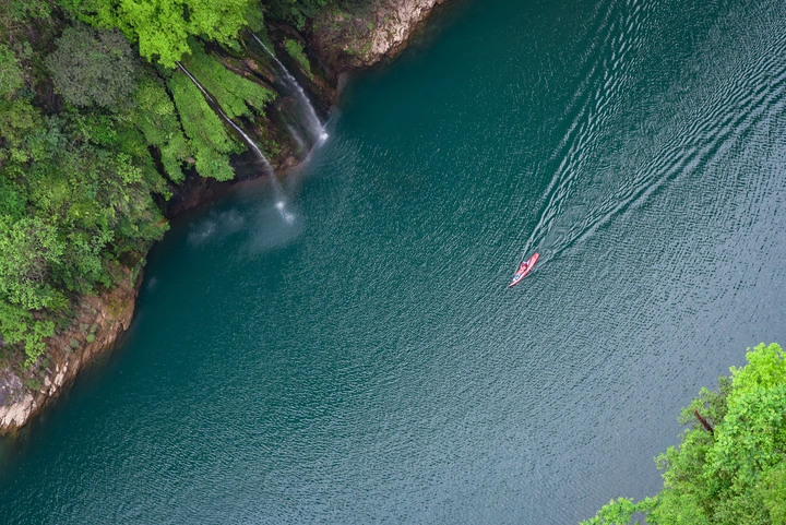 这是在重庆武隆的芙蓉江拍摄的。夏日的山谷十分寂静,山间的瀑布传来若隐若现的流水声,溪水是碧绿的,此时看见一个红色的小舟出现在画面中,十分抢眼。瞬间我就体会到什么叫自由,什么叫清凉了,虽然我只是一个看客。
