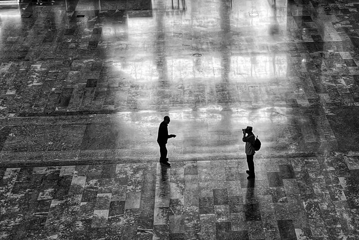 图四这张黑白摄影作品捕捉了现代都市生活的瞬间,画面中人物在电梯上的剪影与地面的倒影形成呼应,增加了视觉趣味。但要成为一张更有深度的作品,还需要在以下几个方面进行提升: 色彩:黑白影调简洁有力,但灰阶层次可以更丰富,避免出现纯黑或纯白区域,以保留更多细节。 光影:光线运用较为平淡,缺乏戏剧性。尝试在不同时间段拍摄,捕捉更具冲击力的光影效果,例如利用侧逆光勾勒人物轮廓。 构图:构图略显平铺直叙,可以尝试寻找更有趣的拍摄角度,或者通过裁剪来突出主体。例如,可以考虑将画面重心放在电梯上的人物,减少地面反射的比例。 后期处理:后期处理需要更加精细,调整对比度和亮度时要避免损失细节。可以尝试使用曲线工具进行更精细的调整。 主题原创性:主题较为常见,缺乏新意。可以尝试从更独特的视角来观察和表达,例如关注人物之间的互动,或者挖掘更深层次的社会意义。 情感共鸣:照片的情感表达较为含蓄,难以引起观者的共鸣。可以尝试捕捉人物更生动的表情和姿态,或者通过构图和光影来营造更强烈的氛围。 思想深度:照片的社会意义不明显,缺乏深度。可以尝试关注更具争议性或社会意义的主题,或者通过摄影来表达对现实的思考。