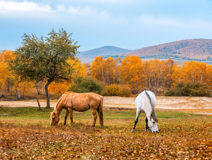 乌兰布统草原褪去青绿,披上辽阔的金黄,像一帧被精心调色的油画,马匹是画中移动的笔墨,勾勒着天地间最沉静的乡愁。佳能Eos R6 Mark|| 70mm f5.6 1/125s ISO125。