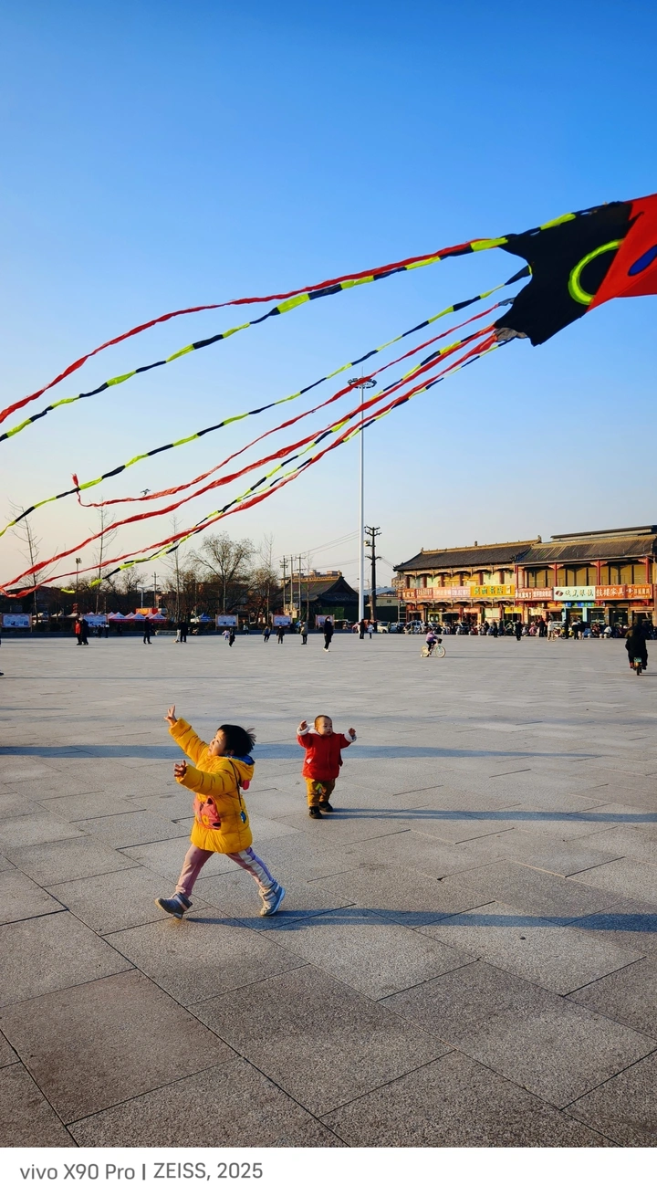 这一年最心动的瞬间,定格在广场上奔跑的两个小身影。彩色风筝划破晴空,小朋友挥舞、追逐。风筝的尾穗和地上一道道影子相互映衬。最妙的是这一切都是未经彩排没有刻意预判的“随手拍”,我也像个得到新玩具的孩子一样满心欢喜。