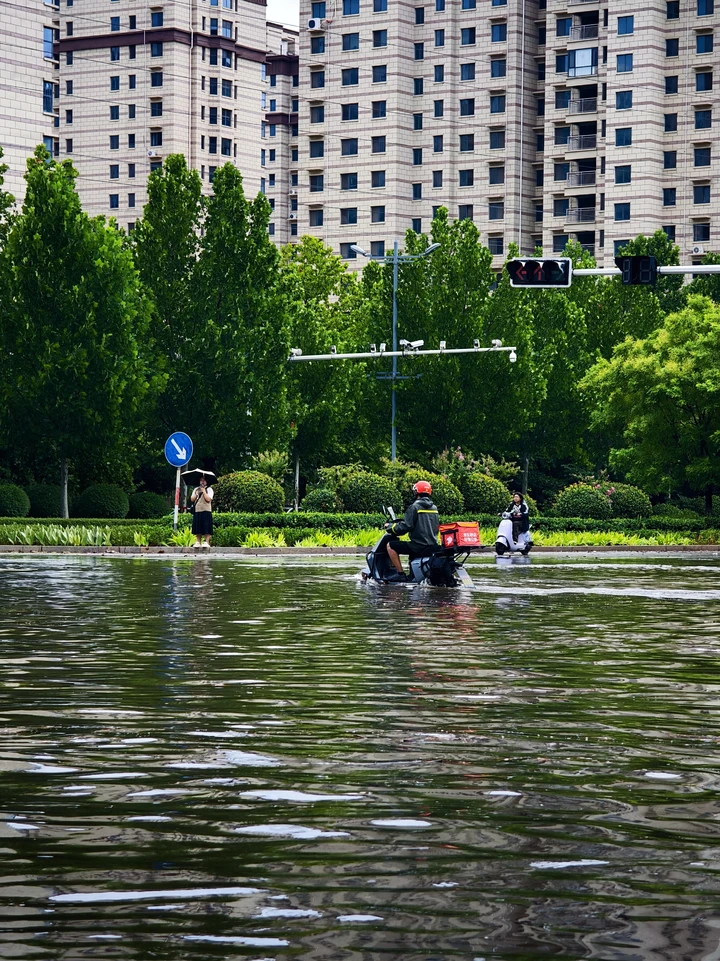 此照片拍摄于山东省梁山县,一场大雨过后,雨漫小城的场景。梁山县是山东省济宁市下辖县,地处鲁豫两省四市交界处,以《水浒传》故事发祥地闻名,2024年常住人口70.5万,GDP达322亿元,拥有国家4A级景区水泊梁山。这张照片捕捉到了城市内涝的场景,一位外卖员骑着摩托车涉水而过,还有一位路人在等待,背景是高楼和绿树,这构成了一种对比,既有城市的现代化,也有自然环境的元素。构图上,摄影师采用了水平构图,水面占据了大部分画面,增强了水患的视觉冲击力。色彩方面,绿色和灰色占据主导,带来一种沉闷和潮湿的感觉。在主题意义上,照片反映了极端天气对城市生活的影响,以及人们在困境中的坚守。整体氛围较为压抑,但外卖员的行动也展现了一种敬业精神。如果能捕捉到更生动的表情或者更有戏剧性的瞬间,作品会更具吸引力。但总体来说,这张照片记录了一个特殊的时刻,具有一定的社会意义和稀缺性。 @米拍社长 @米拍小助手 @米拍编少