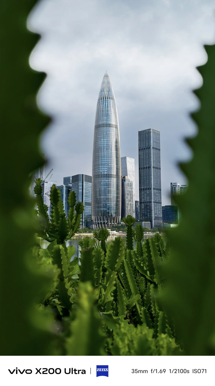 画面透过葱郁的绿植间隙,展现出鳞次栉比的现代高楼大厦。高耸入云的摩天大楼在云层的映衬下显得格外挺拔,建筑的玻璃幕墙在光线之下熠熠生辉。近处生机盎然的绿植与远处繁华的都市景象形成鲜明对比,勾勒出一幅自然与城市共生的独特画面,展现出别样的美感与和谐。