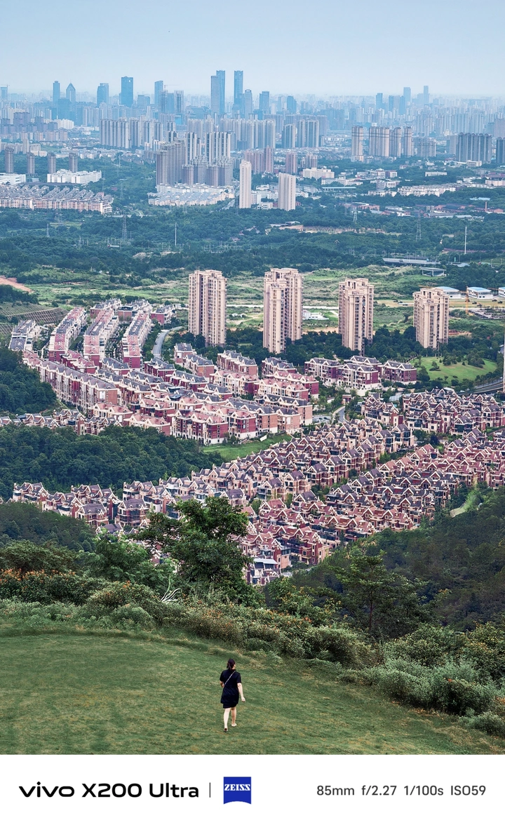 画面中,一位身着黑衣的人独自漫步在葱郁的草地上,背影给人一种悠然自在之感。远处,错落有致的住宅区与林立的高楼依次铺展,城市的繁华与自然的宁静在此交融,展现出一幅城市与自然和谐共存的美妙景象。