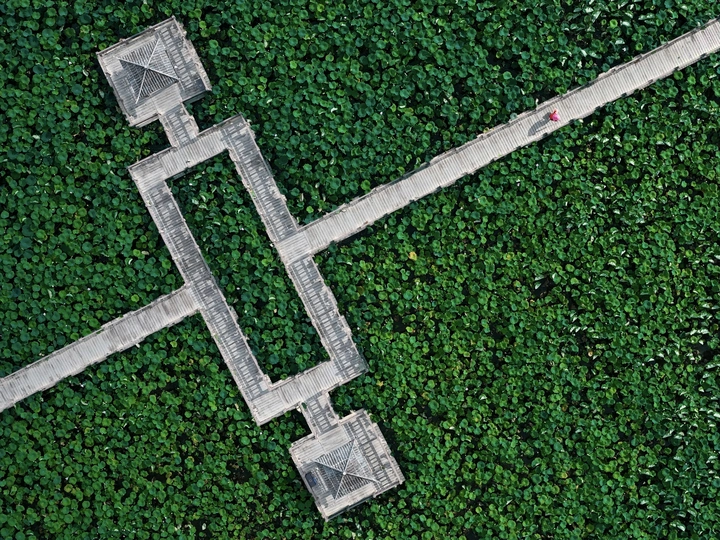 画面展现了一幅独特的景观,大片葱郁的绿色植物铺展成广阔的背景,其间纵横交错着木质栈道。栈道造型别致,蜿蜒延伸,形成富有几何美感的图案。栈道上还有身着鲜艳衣物的行人,为画面增添了灵动的气息。整体给人一种自然与人文巧妙融合的美感,静谧中透着生机。