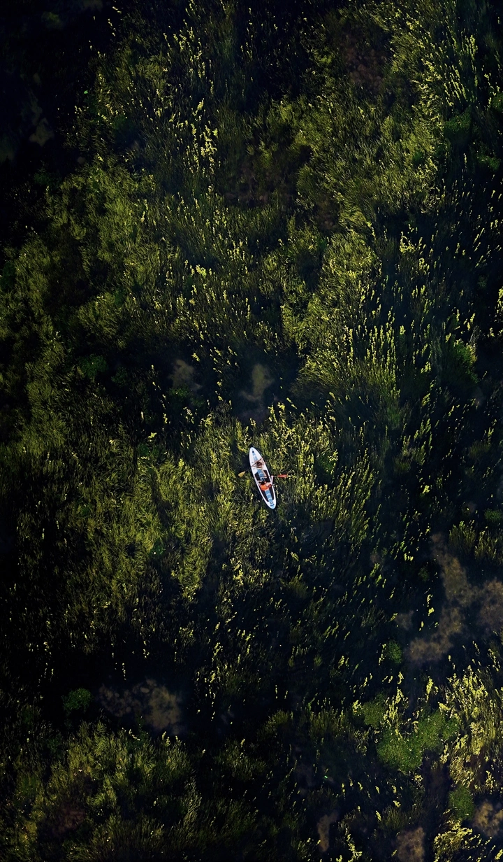 画面呈现了一幅静谧的景象,一艘小船漂浮在布满繁茂绿色植物的水域之上。从空中俯瞰,小船宛如这片绿色世界中的一个点缀,给人一种悠然、宁静且远离喧嚣的感觉,仿佛置身于大自然的怀抱中,享受着独属于此刻的平和与安宁。