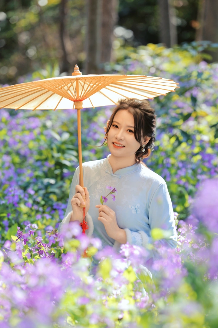 《灵谷兰时》 二月兰香漫紫烟,三春女子立花前。 素衣不染风尘色,油伞轻遮灵谷天。 钟磬无心空对月,芳华有意且随缘。 回眸恰被流光锁,一帧南朝入画笺。 模特:鱼游儿 摄影:许摄 器材:佳能R62+RF70200 2.8