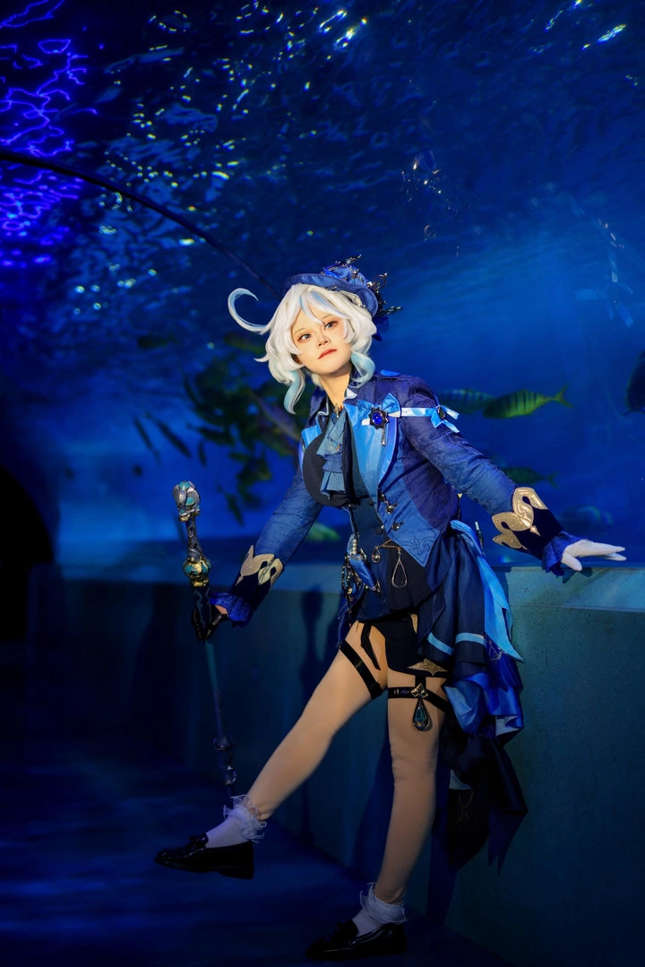 枫丹水神降临深海秘境 原神芙宁娜COS写真|南京海底世界 蓝调光影与游鱼共舞,少女踏浪而来 每一帧都是次元破壁的惊艳 模特:小兔 摄影:许摄 器材:佳能R52+50 1.4+RF24-70 2.8