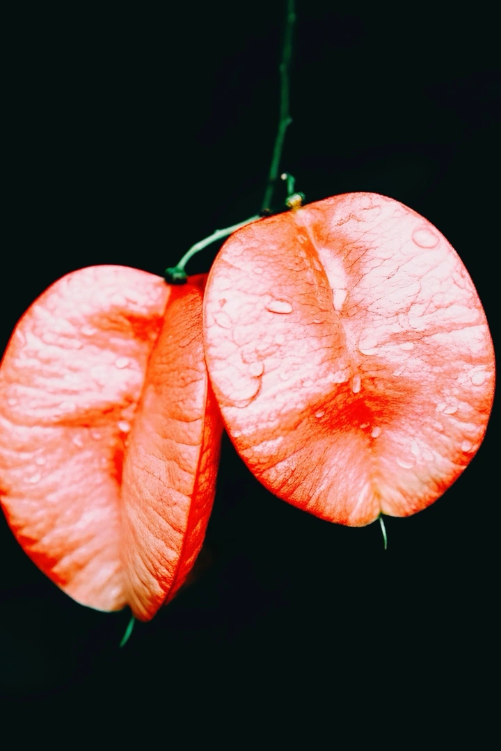 1张 1张- 栾树- 栾树的橙红果荚,形似两盏精致的纸灯笼,轻盈地垂挂在细枝末端。晶莹的水珠点缀其上,在幽深的黑色背景中,散发出静谧而温暖的东方韵味。
