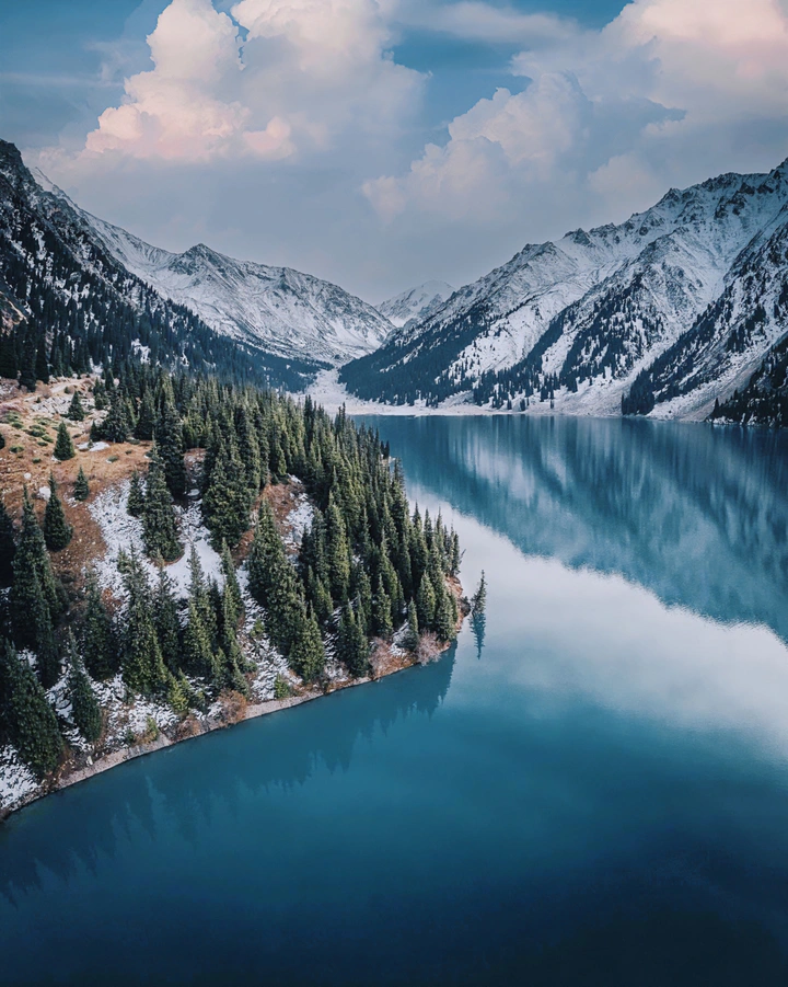 1张 1张- 阿拉木图湖- 阿拉木图湖畔碧波荡漾,雪山倒映湖中,宛如人间仙境。微风拂面,松林低吟,天空湛蓝澄澈,宁静而壮丽。(第一架DJ无人机就是在这里飞丢的)