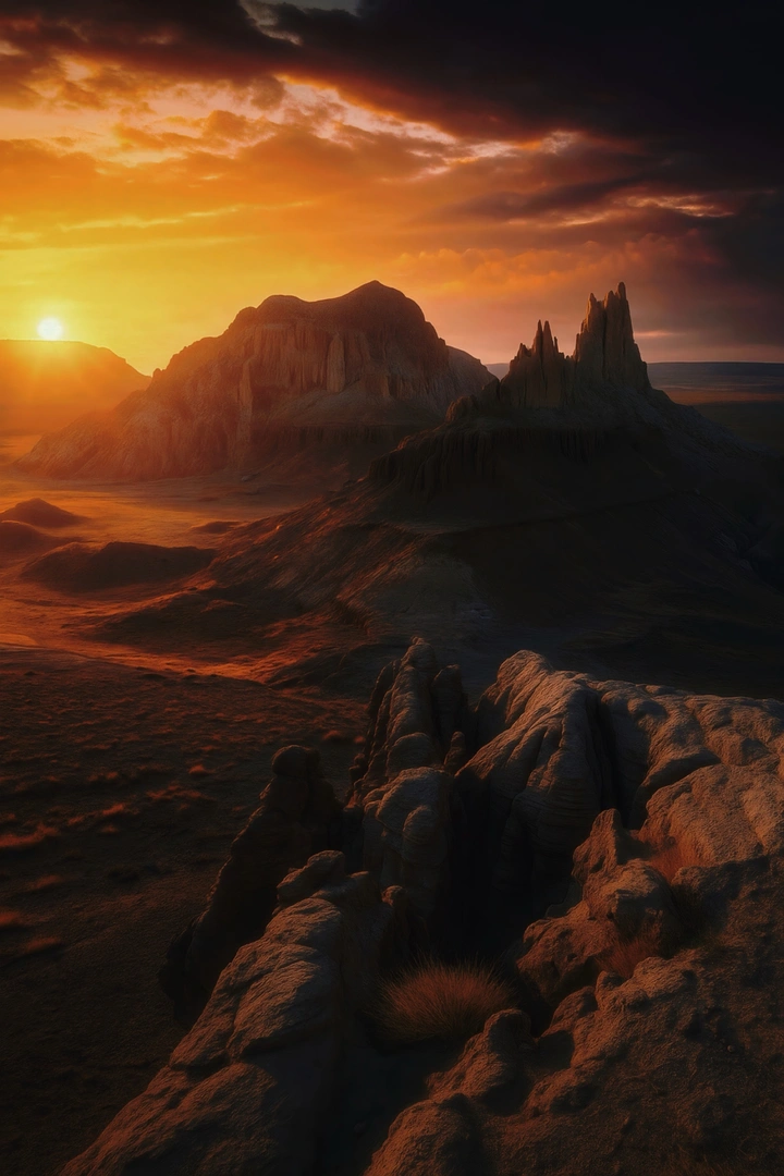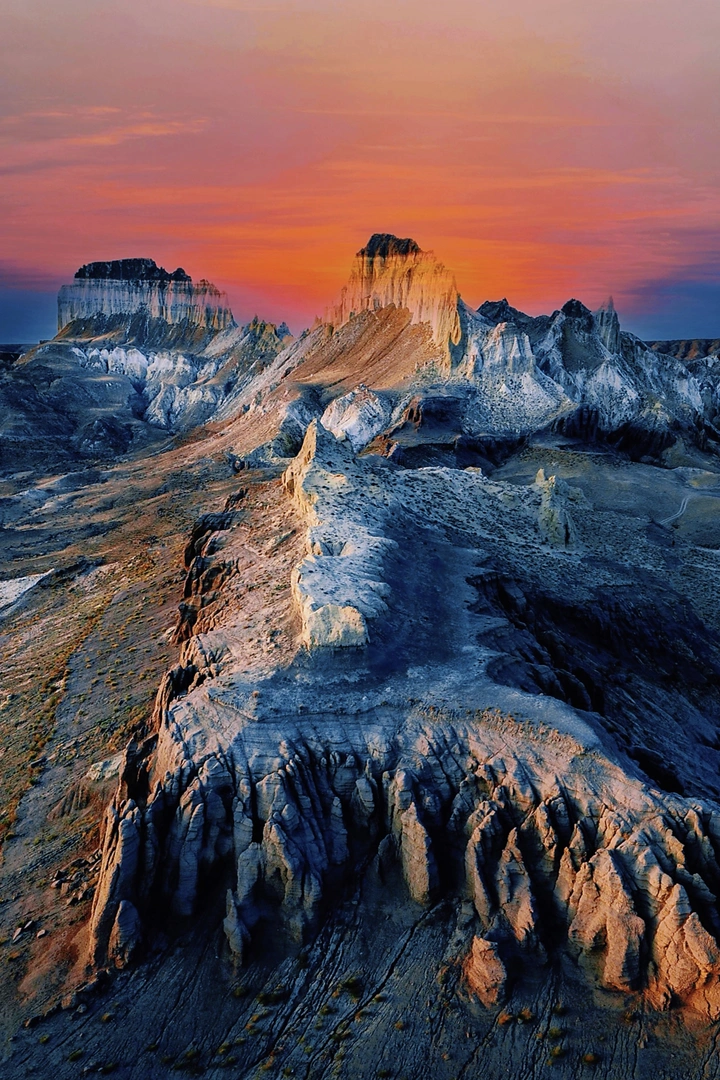 1张 1张- 雅丹地貌的最后一道光- 荒凉的峰群在暮色中沉默,最后一束光在岩石上留下孤寂而温暖的印记。The desolate peaks fall silent in the twilight; the final ray of light leaves a lonely yet warm imprint on the rocks.
