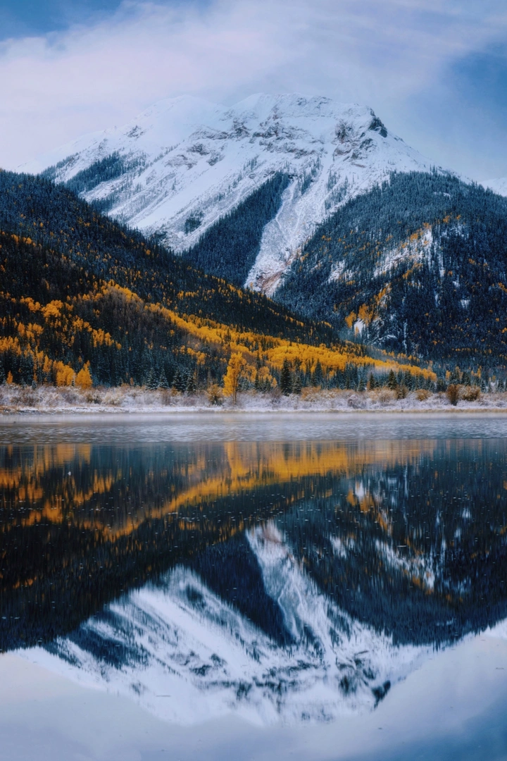 1张 1张- 秋映富士- 秋日的富士山被金黄与绯红环绕,山顶白雪映衬蓝天,如梦如幻。枫叶似火,湖光潋滟,倒影悠然,一派静谧而壮丽的诗意画卷。