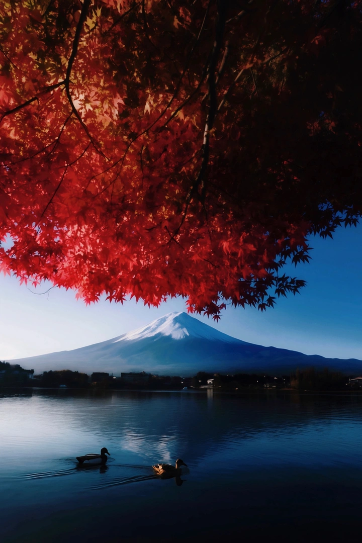 1张 1张- 静谧之秋- 湖水如镜,静静映着雪顶的富士山。红枫似火,在清晨的光影中燃烧着秋意。两只鸭子轻轻划过水面,涟漪荡开,如同时间被柔和地推向远方——这一刻,天地之间只剩宁静与美。