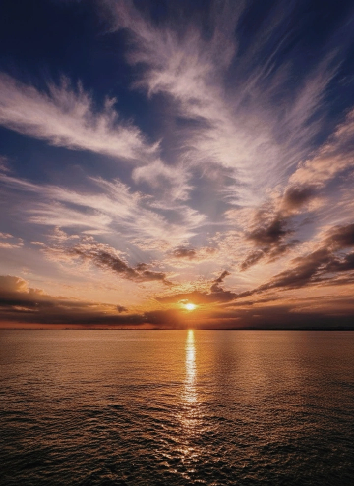 1张 1张- 落日故人情- 夕阳缓缓沉入海面,金光洒满波涛,天空与海交织成温柔的橘红。浪花轻拍岸边,仿佛在低语,这一刻,时间静止,心随落日归于宁静。