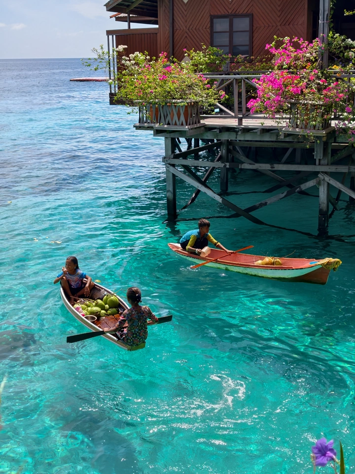 从水屋的错落屋檐,到独木舟上的椰子、海鲜与身影, 镜头里藏着仙本那的两种模样: 一边是度假者的乌托邦, 一边是海上游牧民族的日常。 澄澈的海水是共同的底色, 木与海的对话, 在每一道波纹里, 写着关于生存与诗意的故事。