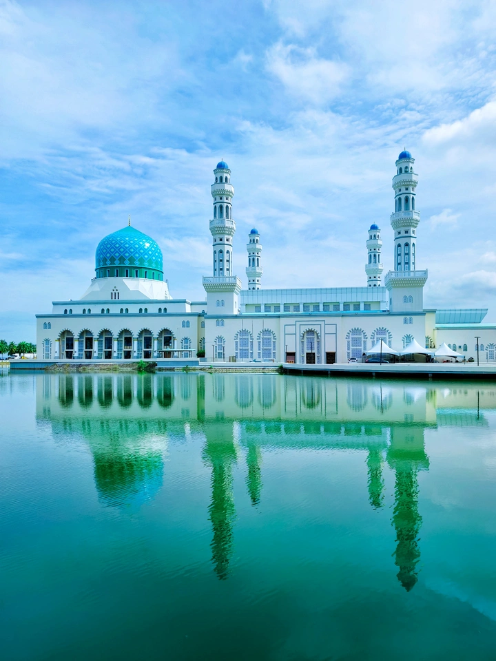 风掠过沙巴的湖面, 把清真寺的穹顶揉成对称的诗行。 绿松石色的圆顶在水中舒展, 宣礼塔的轮廓与云影轻轻重叠, 一静一动,都是信仰的模样。 我站在岸边, 看时间被这面水镜温柔拉长, 连呼吸都放得很轻, 怕惊扰了这片刻的宁静。