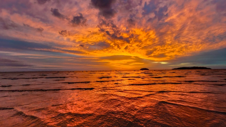 从仙本那飞往亚庇时,雨丝正敲打着舷窗。 原以为要和这场黄昏失之交臂, 不曾想, 老天却把所有的浪漫都攒成了一场晚霞大爆发。 亚庇丹绒亚路,世界第三的落日名不虚传。 今晚,它用一整片燃烧的橘色晚霞,在海面写下最温柔的注脚。 镜头里的每一道波纹,都替我收藏着这份远道而来的幸运。🌅 我站在海里,安静地,听浪,见光,等灵魂归位。 2026.03.11摄于亚庇🌆