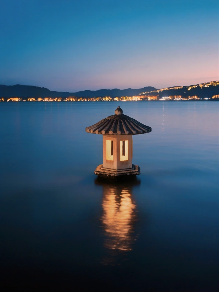 风过水面,灯影成诗。 蓝调暮色漫过湖面,石灯的暖光在涟漪里轻轻摇晃,把西湖的夜酿成了一首温柔的诗。