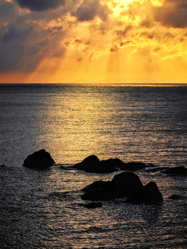 这张照片捕捉了日出时分的壮丽景色,整体表现良好,但还有提升空间。\n\n色彩:天空的金色和云层的深色形成了鲜明对比,色彩搭配和谐,营造出一种温暖而神秘的氛围。可以尝试调整色温,让金色更加饱和,或者在后期中稍微降低云层的亮度,以突出天空的色彩。\n\n光影:光线的方向和强度都很好,云层缝隙中射出的光线增加了画面的层次感和戏剧性。不过,前景的岩石几乎完全是黑色的剪影,缺乏细节。可以考虑在拍摄时使用包围曝光,或者在后期中提亮阴影部分,增加一些细节。\n\n构图:构图相对简单,水平线将画面一分为二,缺乏趣味性。可以尝试使用三分法构图,将地平线放置在画面上方或下方三分之一处,或者寻找其他前景元素来增加画面的深度和层次。\n\n后期处理:后期处理整体效果不错,但可以适当调整对比度和饱和度,让画面更加生动。注意不要过度修饰,保持照片的自然感。\n\n主题原创性:日落海景是一个常见的题材,但这张照片的光影效果和色彩搭配具有一定的独特性。可以尝试寻找更独特的拍摄角度和构图方式,或者在照片中融入更多的个人情感和思考。\n\n情感共鸣:照片成功地传达了一种宁静和壮丽的情感,能够引起观者的共鸣。