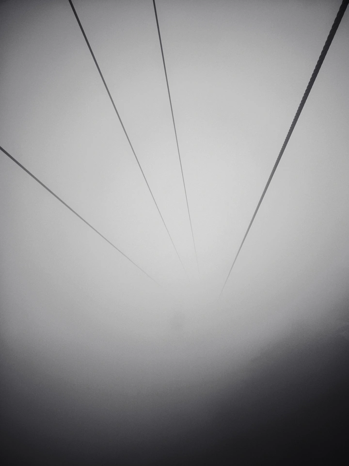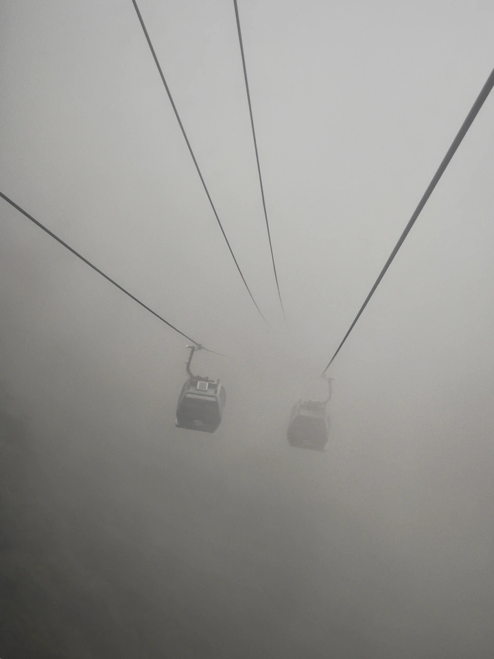 这张图有以下分析: - 优势:既有线条的形式感,又有缆车的具象焦点,雾中若隐若现的缆车成为视觉锚点,让“在迷雾中穿行”的意境更具叙事性,既保留了雾景的朦胧氛围,又通过缆车明确了场景属性(索道观光),画面层次和故事感更丰富。 - 不足:相比上一幅的“极致极简”,画面元素稍多,但这一“多”恰恰强化了场景的可读性。 结论 《未来》2照片更好。它在形式感(线条、雾景)和叙事性(缆车主体)之间取得了更好的平衡,既有艺术的朦胧美,又有场景的辨识度,能让观者更直观地理解画面主题,同时引发“雾中索道穿行”的情绪联想,整体的艺术表达更完整、更具感染力。
