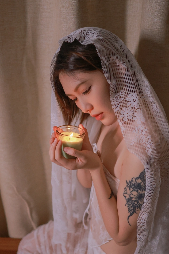 白纱柔曳似梦,蕾丝与烛光合鸣,在静谧里织就一场慵懒诗意的柔美清梦。
