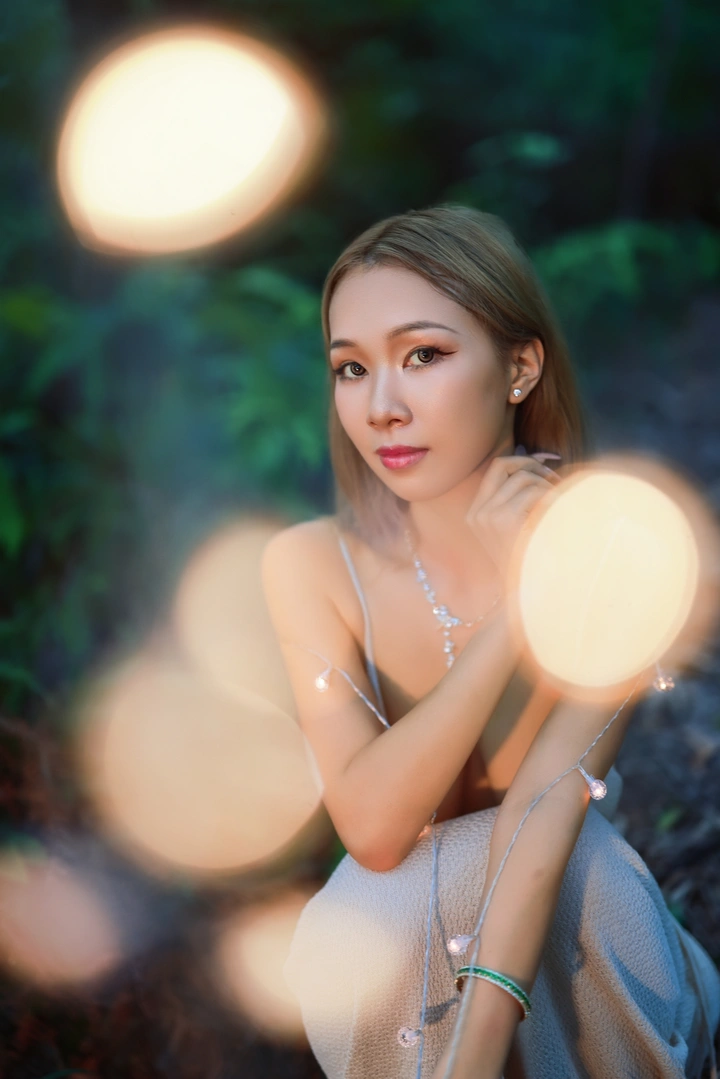 在葱郁林间,灯串如梦的碎片缀满时光,她是秘境里的造梦者,让每一缕光斑都成了森林的私语,在绿野深处织就一场关于光与美的迷幻长梦。