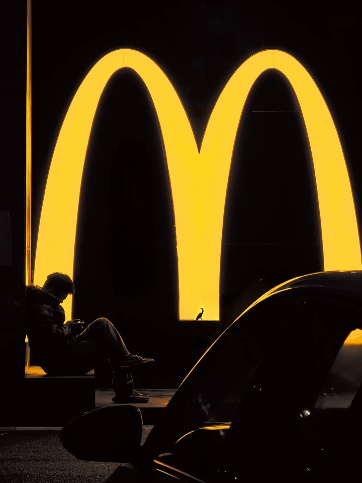 傍晚路过金拱门,巨大的M标背景照着玩儿手机的年轻人,还有不知道哪家小朋友放着的小玩具。停在前方的黑色汽车也被勾勒出一圈金边~