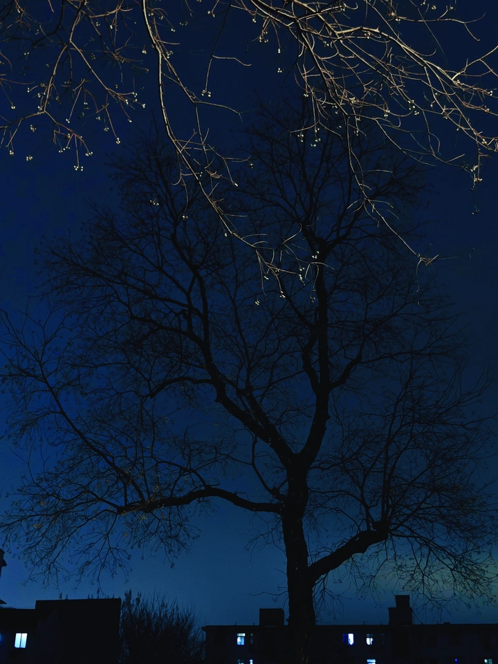 年后一直的阴雨,昨晚难得舒爽放晴。八点后天色还有些许蓝调,马路和街道上暖色灯光映衬夜色的蓝构成舒服的暗调画面,静谧而美丽。