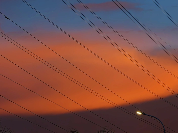 傍晚时分,天空像被染了色,电线纵横交错,路灯亮起来,像是在给这美丽的天色添上一点生活的小光亮。
