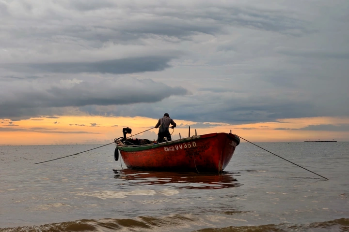 归港的渔船停在海面,船上渔夫正用力拉绳,在夕阳在云层缝隙间的余晖衬托下,那撑起全家希望的背影显得十分的伟岸!