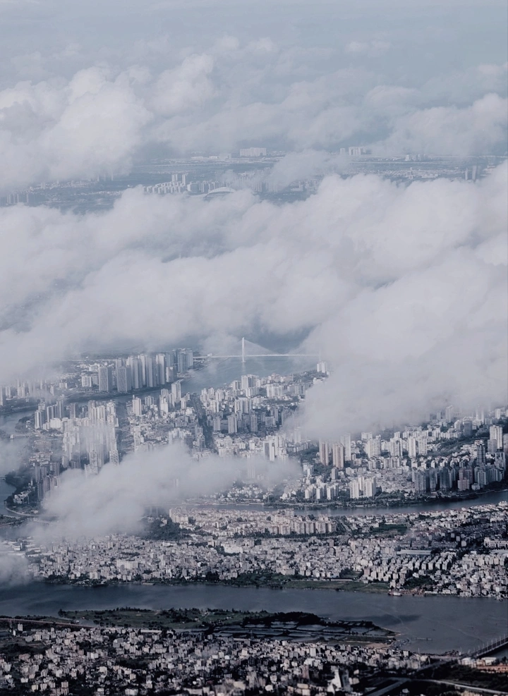 航拍视角下,云海如轻纱漫过海口的楼宇与江河,现代建筑与自然云雾交融,勾勒出这座海滨城市的空灵与繁华。
