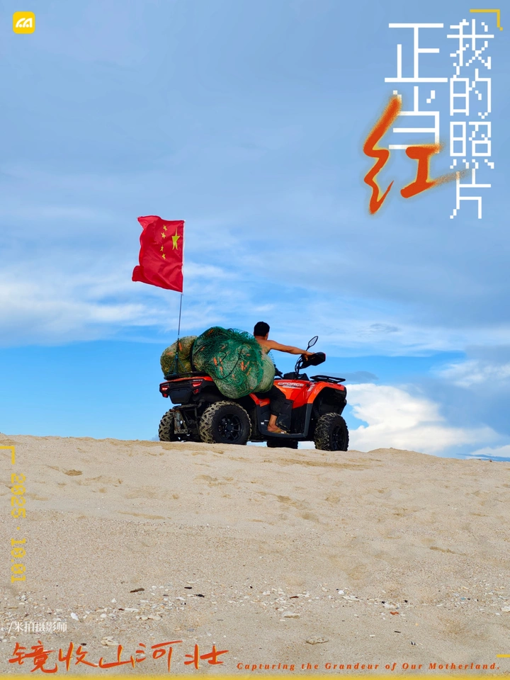 沙滩车上五星红旗迎风招展,国庆里的海滨劳作,是对祖国山海和边疆的别样守护。
