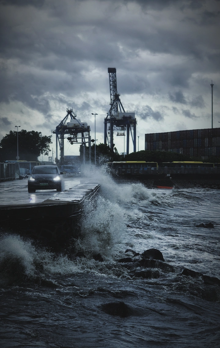 台风到来前夕,涌动的海浪不断的在拍打着码头,溅起巨大的浪花扑向岸上,一辆汽车独自在踏浪前行,车灯在昏暗的环境中格外醒目,仿佛在风暴中开辟出一条道路,孤勇前行!