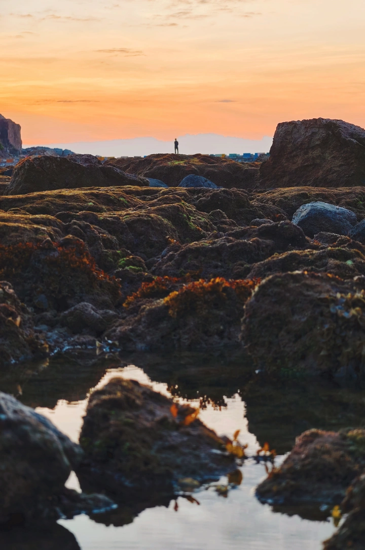 日出时刻,朝霞映红了海边退朝后的礁石,现在远处的人影,就像现在那遥远的彼岸,等待着日出日落!
