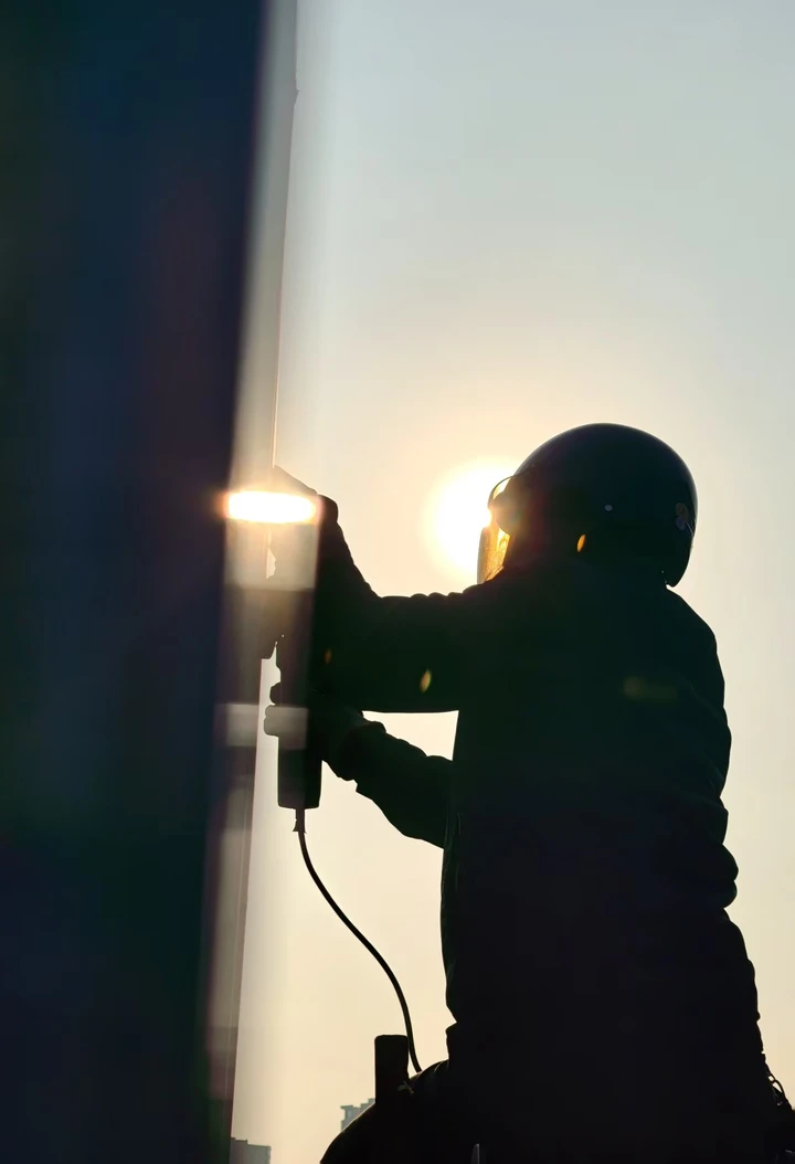 焊枪的火花与朝阳的金辉交叠,在金属与光的碰撞里,在逆光里勾勒轮廓,用炽热的光书写平凡的坚守。