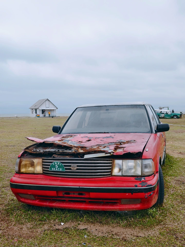 锈蚀的皇冠停在清风海岸,阴云下的白屋与旧车,共同凝固成一段被海风遗忘的时光。
