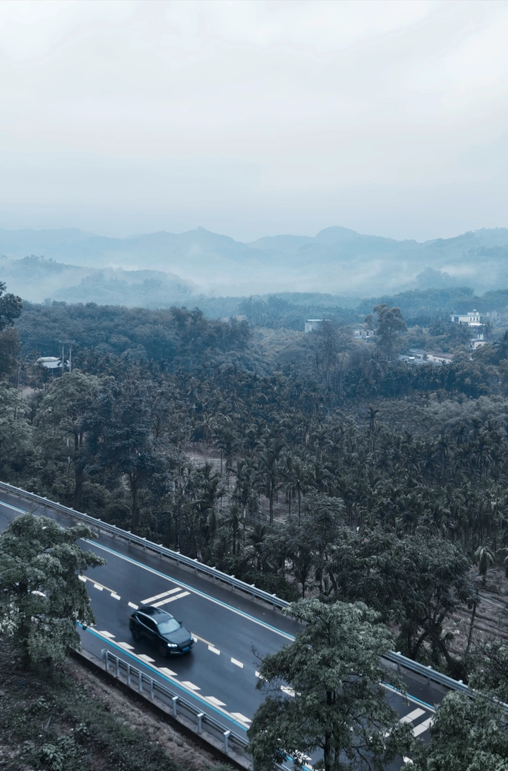冷雾漫过群山,汽车穿行在苍翠林海间,把喧嚣藏进朦胧的山野呼吸里。