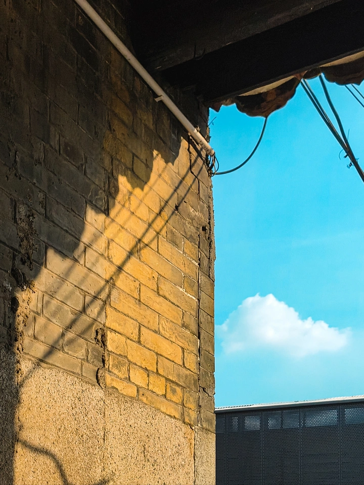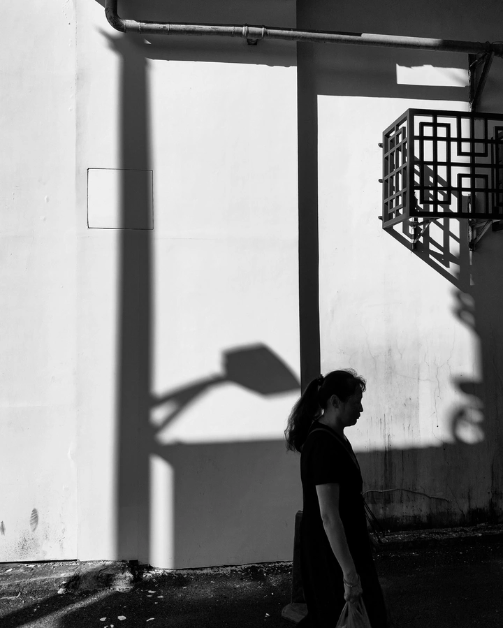 早上的阳光洒在墙上,形成了阴影,这时刚好有一个人经过,为这画面增加了趣味性。