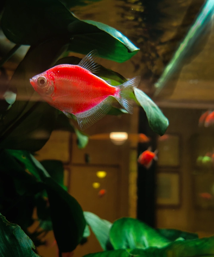 图中水族箱内色彩斑斓的鱼儿、繁茂的绿植是一方灵动的“虚幻”小世界,而透过玻璃映出的暖光吊灯、室内陈设则锚定了“现实”空间。二者交融时,水族箱似隔断又似联结,让现实的暖调场景与虚幻的水下生机相互渗透,仿佛在同一空间里,现实的烟火气与虚幻的自然意趣完成了一场温柔对话,模糊了边界,也让视觉与感知在这层玻璃的分隔中,于现实和虚幻间游走~