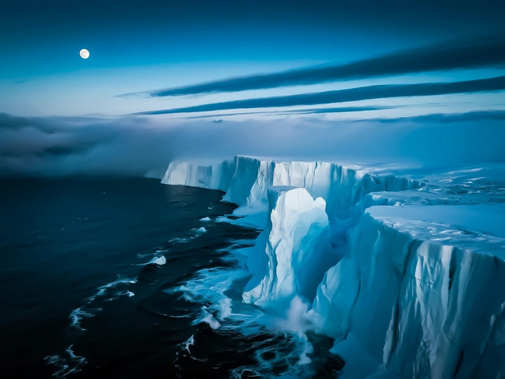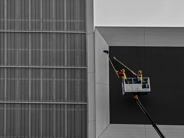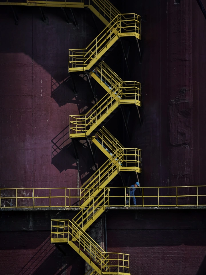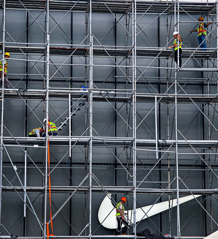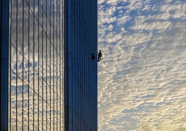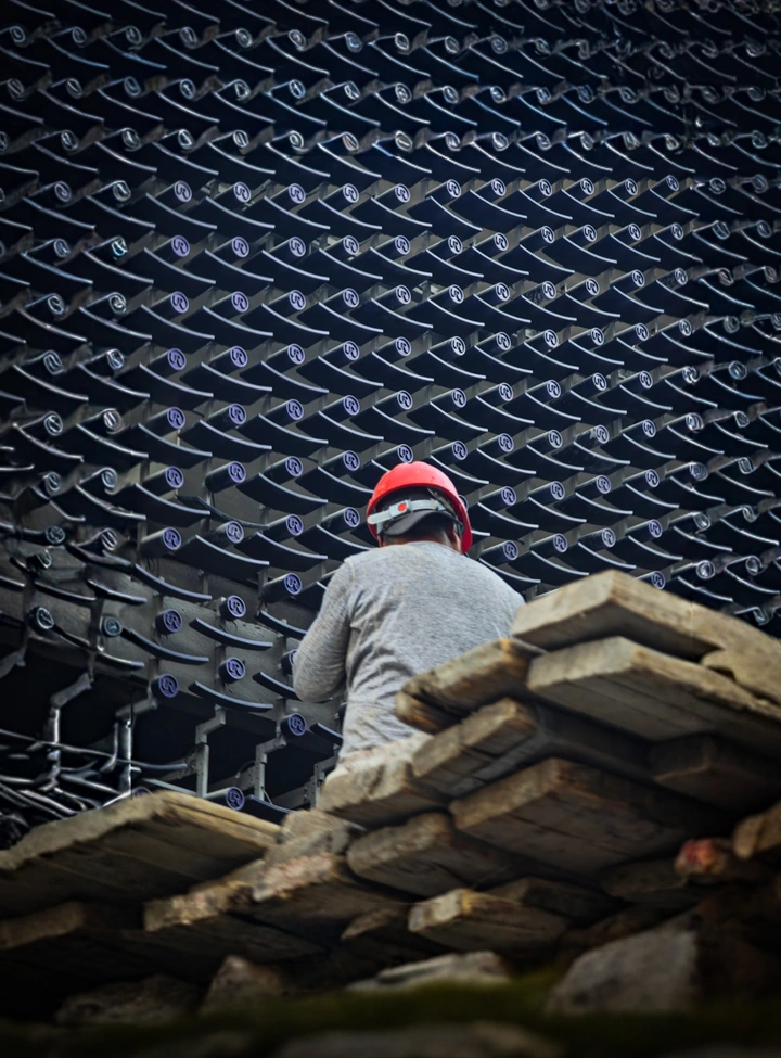 偶然漫步北京城, 见高楼防护网上工人作业。 画面以大面积蓝色防护网为主, 未聚焦其工作姿态, 意在凸显工人成果, 也隐喻生活的牢笼。