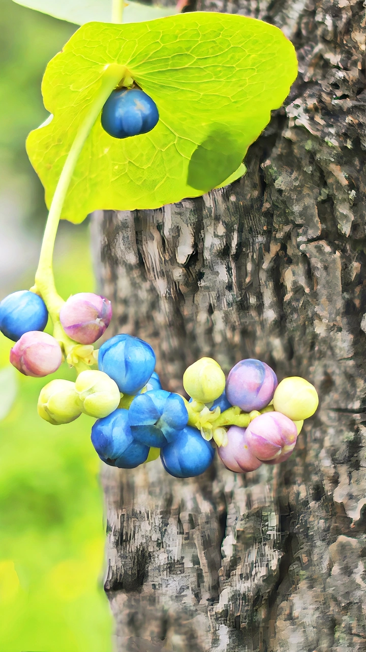 第一次见这么美丽的野草-杠板归,浑身上下都是刺。秋序渐浓,它的果子五颜六色的,有蓝色的、粉色的、淡绿色的,像一串小铃铛一样。