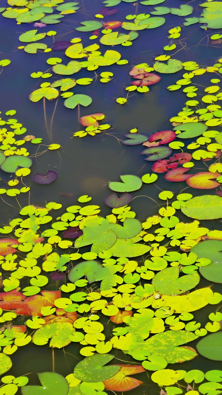 荷塘里的小荷叶,它的颜色五彩斑斓,秋色已经拉开了帷幕,