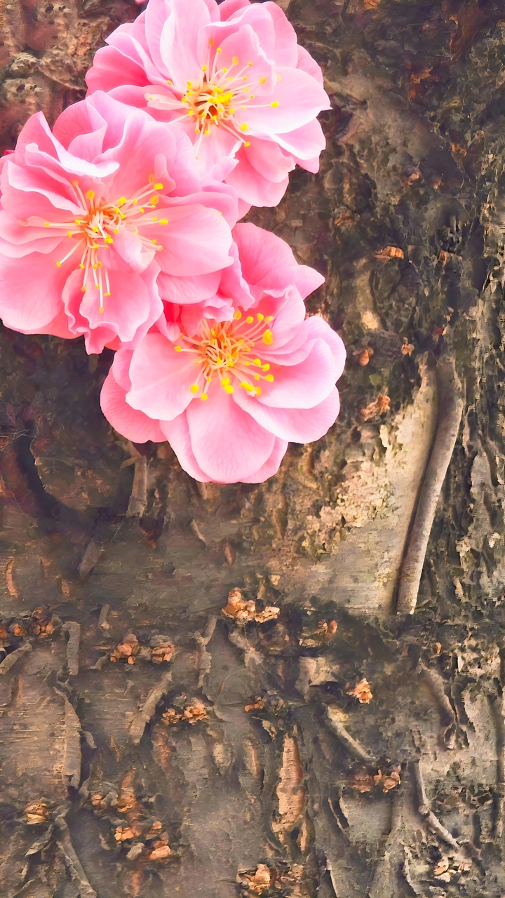 一朵柔粉黄蕊如星,粗糙的树皮,柔嫩花颜,它是刚与柔的碰撞。